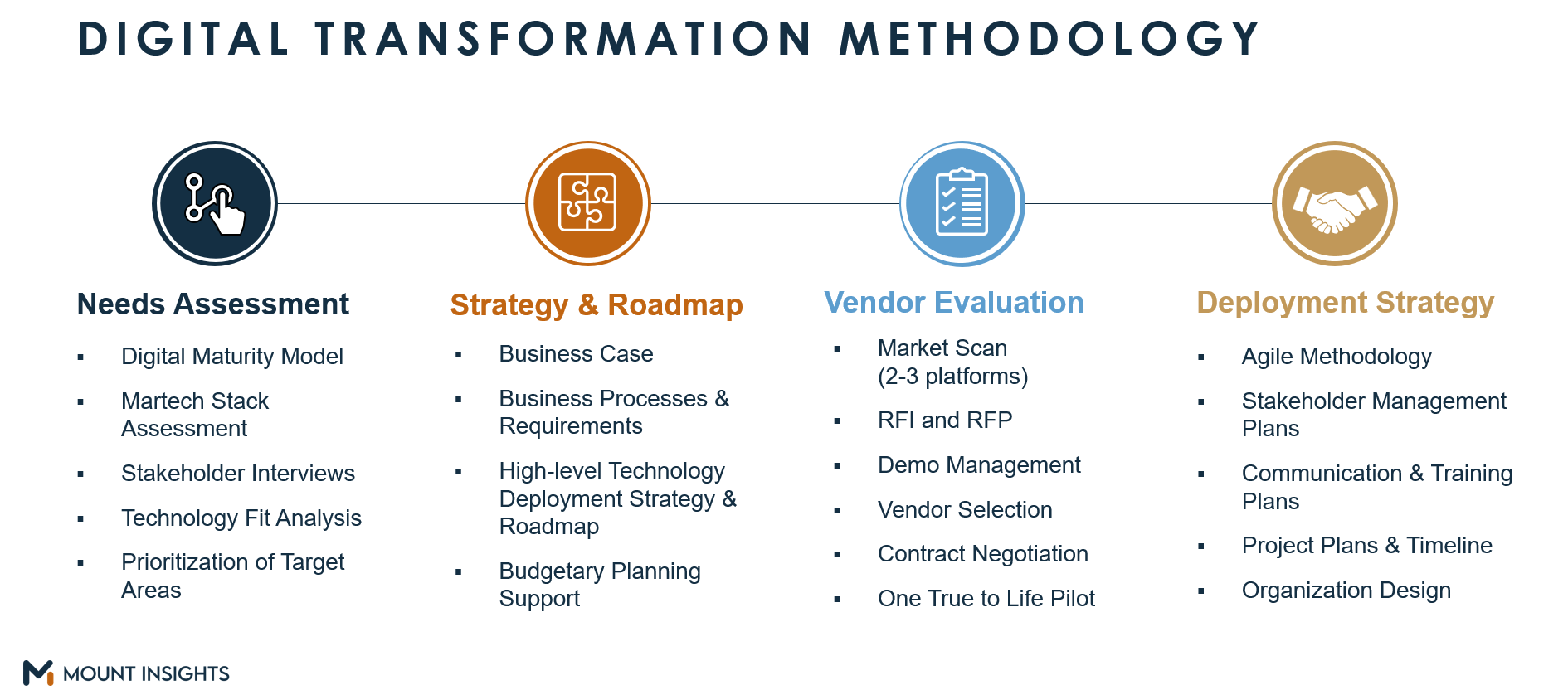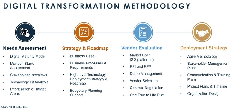 Assess Business Needs: Evaluate your firm using the Mount Insights’ Seven Dimensions of Digital Maturity and provide you with a detailed report on the tools that best fit your business.