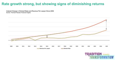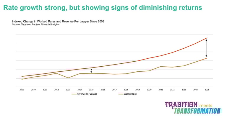 She opened with rate growth. For the past decade, rate increases have been doing most of the heavy lifting for law firm revenue. And on the surface, that trend continues. But the chart she showed revealed something important: the gap between rate growth and revenue-per-lawyer growth is widening. Rates are going up, but they're producing less incremental value than they used to. The link between pricing and growth is loosening.