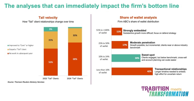 She introduced two analytical frameworks that any BI or CI team can apply to client financial data. The first is tail velocity. Most firms have a long tail of low-value, episodic client relationships that add activity but not momentum. The data consistently shows that most tail clients never graduate upward and many disappear entirely. Chasing growth in the tail is expensive and, more often than not, wishful thinking.