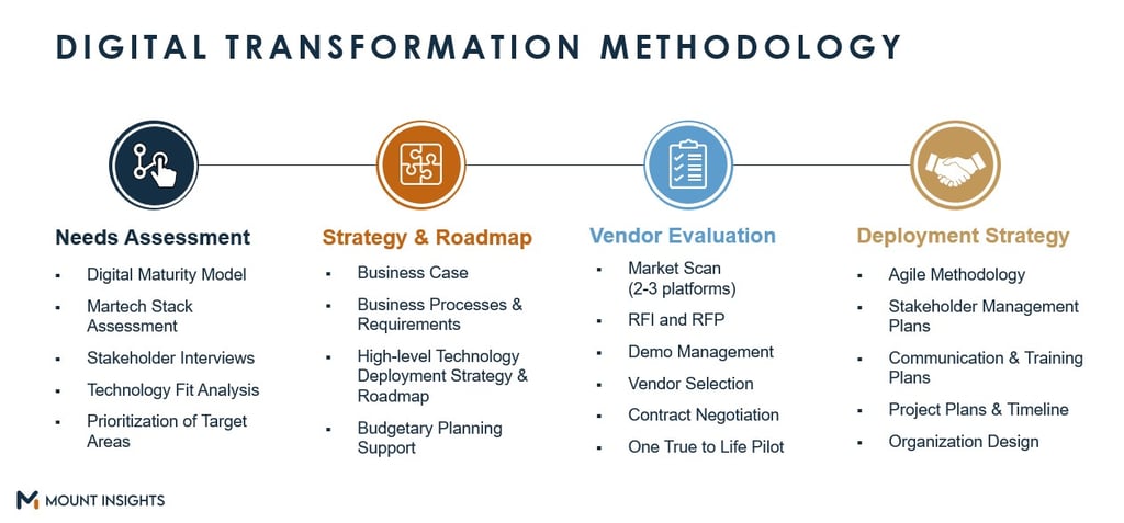 At Mount Insights, we've developed a comprehensive digital transformation methodology to guide law firms through this journey. Our approach leverages our team's unique blend of experience as both legal technology vendors and in-house technology and marketing professionals.